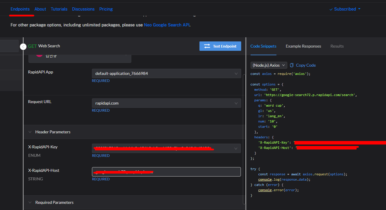 이번에는 Rapidapi의 api를 사용해서 구글 검색기능의 프로젝트를 만들어 보려고 한다.